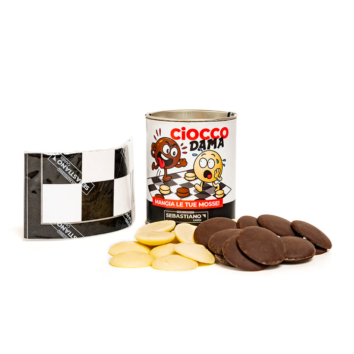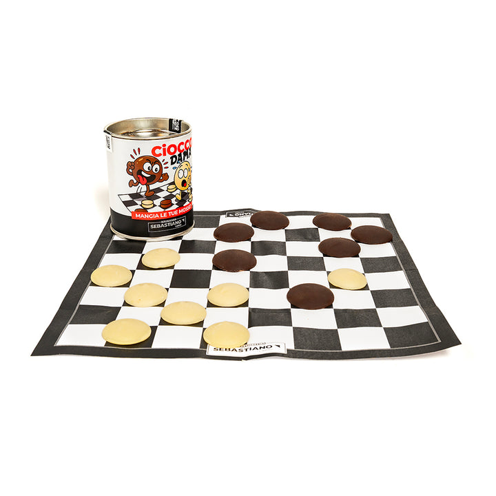 Drops di cioccolato fondente e cioccolato bianco per giocare una divertentissima partita di dama.